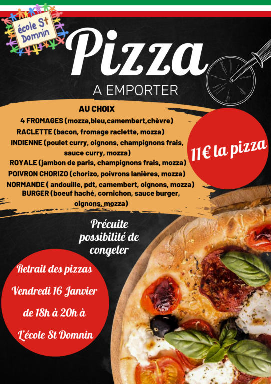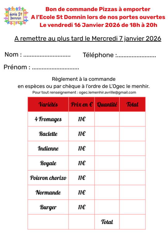 L’OGEC organise une vente de pizzas à l’occasion des portes ouvertes de l’école qui auront lieu le 16 janvier 2026 (17h – 19h).
